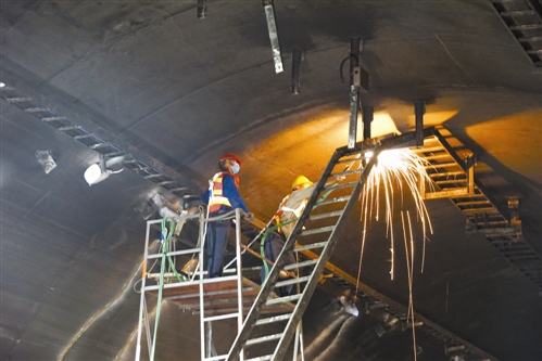 另一處作業(yè)面,負(fù)責(zé)焊接的王師傅拿著器械,正目不轉(zhuǎn)睛地盯著焊接面?!昂附訉?duì)精度技術(shù)要求很高,焊縫還要檢測(cè),得一次成型,否則施工就不合格。”從事多年電焊工的他常常腰酸腿疼,落下“身疾”,“不過(guò)時(shí)間久了也就習(xí)慣了,堅(jiān)持就是勝利。”王師傅依然很樂(lè)觀地看待自己的工作。