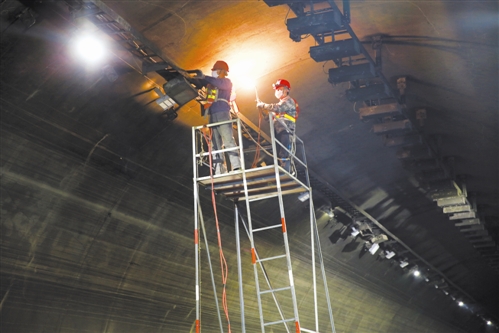 走進(jìn)隧道,一股冷風(fēng)侵襲,洞內(nèi)風(fēng)大又潮。來(lái)自湖北的游師傅,負(fù)責(zé)噴隧道墻面乳膠漆。他有著20多年的豐富經(jīng)驗(yàn),在施工現(xiàn)場(chǎng),他頭戴安全帽,身穿反光背心,緊系安全繩,一個(gè)人站在高高的架子上,底下4名工人不時(shí)緩緩地推動(dòng)登高架。游師傅全然不顧洞內(nèi)的濕冷,大手一揮,熟練而均勻地噴灑著油漆,沒(méi)多久墻面便嶄新一片。