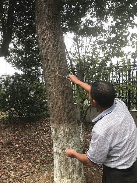 上圖為技術(shù)人員在防治白蟻受災(zāi)處 為全面消除隱患,該所立即組織人員對(duì)員工宿舍、綠化帶、辦公樓逐一進(jìn)行地毯式排查,最終發(fā)現(xiàn)三處地方受災(zāi)最為嚴(yán)重,同時(shí)在員工宿舍旁綠化帶處找到白蟻窩。該所負(fù)責(zé)人及時(shí)聯(lián)系建設(shè)局房管處白蟻防疫站技術(shù)人員,對(duì)樹(shù)木、門框等進(jìn)行防治消殺和用白粉涂擦等方式排除隱患,通過(guò)防治消殺和白粉涂擦等方式,有效確保了所內(nèi)環(huán)境的生態(tài)資源健康和安全。