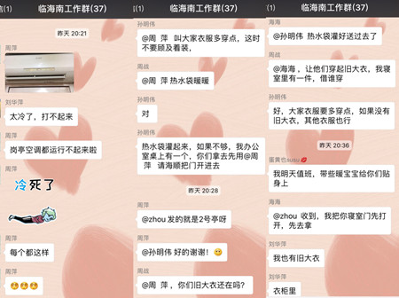 “太冷了,崗亭空調全都運行不起來了?!?/span> “每個崗亭都一樣?!?/span> “冷死啦!” “修空調的師傅來了,檢查了一下,他說這個沒辦法,是因為天氣太冷的原因,并不是壞了?!?/span> “大家衣服趕緊多穿點,誰有舊的工作大衣?!?/span> “熱水袋灌起來,不夠,我的拿去先用?!?/span> “我也有舊大衣?!?/span>