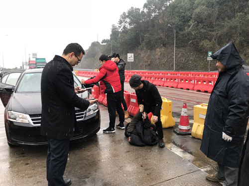 31日是春運(yùn)的前一天,下起了今年的第一場(chǎng)大雪。當(dāng)天10:30分左右,三號(hào)車道如往常一樣正常、有序,該車道正在檢查綠農(nóng)車。這時(shí)一輛牌照為浙JVIT6*黑色小轎車緩緩駛?cè)?,突然該車加速調(diào)整方向,想朝二號(hào)車道沖去。與此同時(shí)從它后方快速?zèng)_出一輛轎車檔在了該車前面,接著后方又沖出一輛黑色轎車,攔截在該車后方的去路。兩輛車上跳下幾個(gè)大漢,以迅雷不及掩耳之勢(shì),一擁而上干脆利落的將車內(nèi)三名犯罪嫌疑人控制。 當(dāng)班收費(fèi)員被這一幕驚呆了,不過迅速反應(yīng)過來,啟動(dòng)應(yīng)急預(yù)案,呼叫監(jiān)控員,監(jiān)控員在監(jiān)控視頻中發(fā)現(xiàn)這個(gè)情況后,第一時(shí)間通知所長(zhǎng)。所長(zhǎng)孫明偉得知情況后立即趕赴現(xiàn)場(chǎng),確認(rèn)核實(shí)身份,并令當(dāng)班班長(zhǎng)第一時(shí)間聯(lián)系當(dāng)?shù)嘏沙鏊藢?shí)身份。在得到明確的答復(fù)后,工作人員立刻封閉該車道,為民警辦案提供方便,并打開備用車道正常收費(fèi)疏導(dǎo)過往車輛,組織人員疏散圍觀群眾避免車輛和人員停留過多影響民警辦案。
