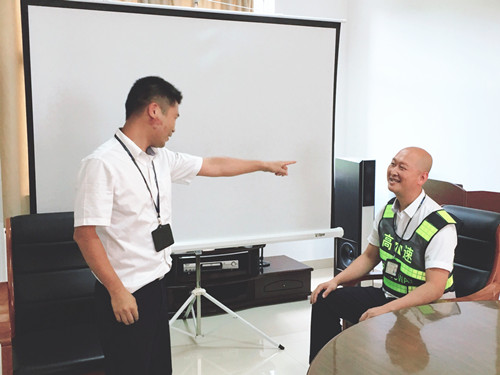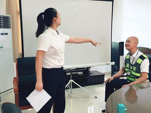 圖為員工扮演駕駛?cè)藛T 此次培訓(xùn)一改枯燥乏味的傳統(tǒng)形式,工作人員結(jié)合平時窗口實際工作,分別擔(dān)任角色扮演,生動而又形象地演繹窗口服務(wù),真實地反映出收費員在收費過程中遇到的各類情景。比如:ETC車道無法正常通過、遇堵車分流、駕駛員情緒激動、綠農(nóng)車混裝未達到免費、入口如何勸離超限車輛等各類突發(fā)事件應(yīng)急處理辦法。