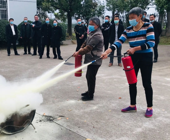 圖為使用滅火器演練 隨后,該所開展滅火器使用模擬演練。在演練中,大家利用平時更換下來的舊滅火器,依次輪流進(jìn)行操作,更有一些員工主動熱心幫助保潔阿姨們講解如何正確使用滅火器,以身示范正確操作方式及每一個分解動作要領(lǐng)。