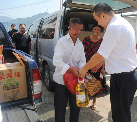 圖為臺州收費所黨支部書記王小勇給困難戶送上慰問品 潘山頭村共有22戶困難戶,因時間關(guān)系,臺州收費所黨支部一行走訪了其中3戶困難家庭,對于其他19戶困難家庭委托該村“兩委”領(lǐng)導代為慰問。每到一戶,支部書記王小勇都詳細詢問了解困難群眾的生活情況,勉勵他們積極面對生活,戰(zhàn)勝困難,同時為他們送去了中秋月餅、食用油、干果等慰問品及節(jié)日問候。