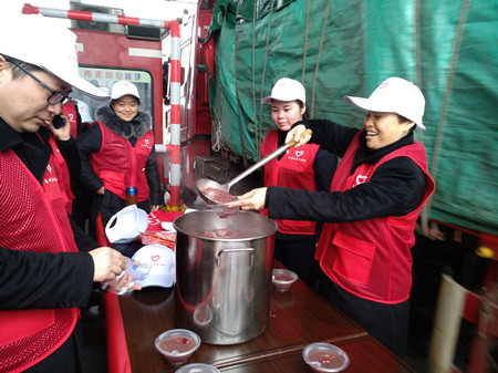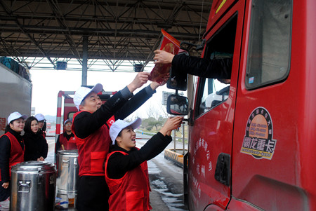 圖為志愿者給過往司機(jī)送上臘八粥