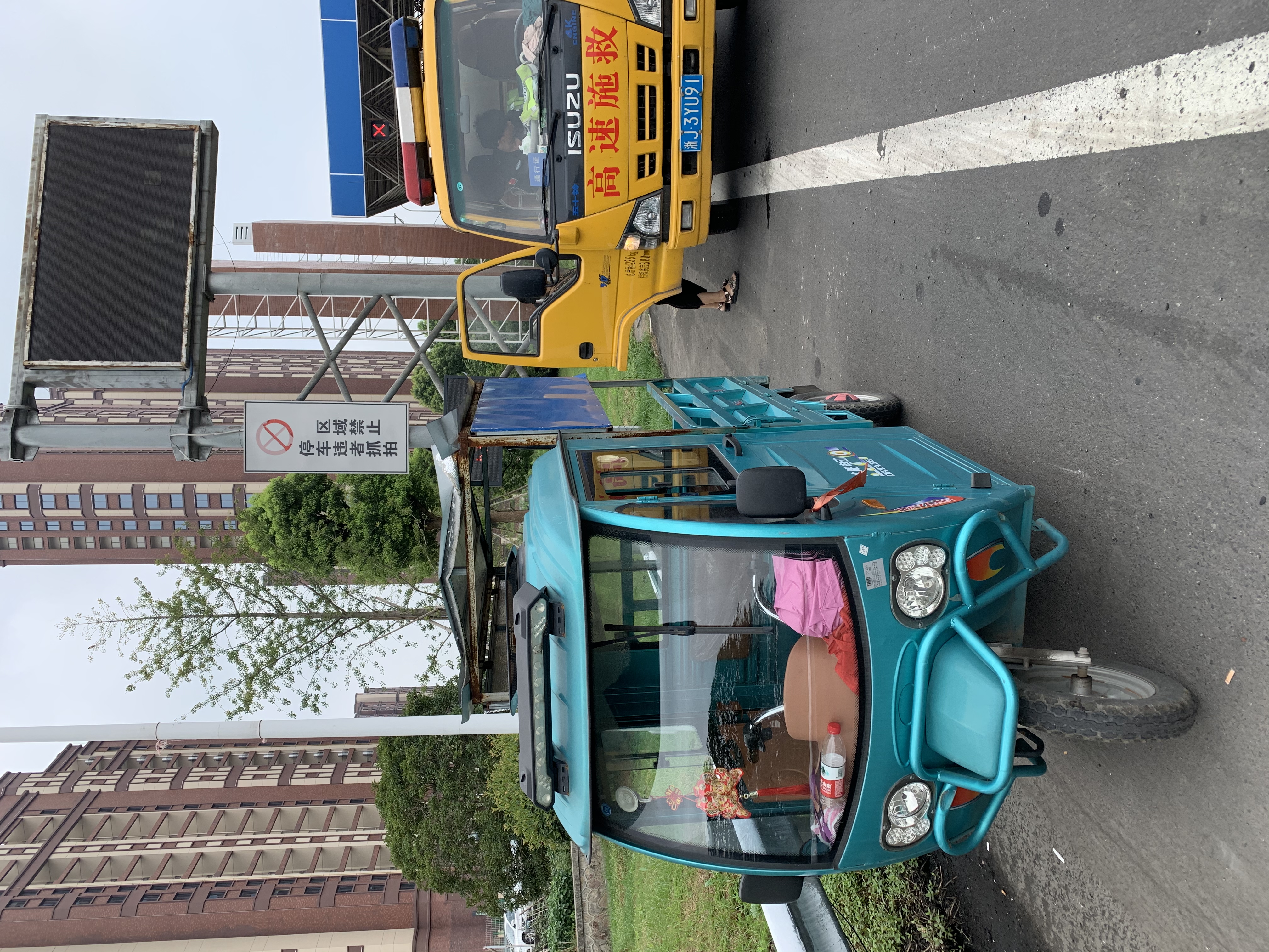 三輪車誤入高速 危險?。?! 7月26日上午,一輛電動三輪車緊跟在大貨車后面開進臺州收費所入口車道,被發(fā)現(xiàn)后不顧收費員勸阻,撞開欄桿,直奔寧向入口匝道。 10點18分,收費員發(fā)現(xiàn)此電動三輪車緊隨大貨車試圖進入高速,立即勸阻,但三輪車主不聽勸,收費員準備出崗亭勸返時,她直接撞開欄桿向前行駛,收費員立即用對講機匯報了情況。此時正在出口處理特情的班長聽到后,快速往匝道口追去,邊追邊喊,并通知監(jiān)控中心,然而三輪車加速前行。10點30分左右,交警在主線找到這輛三輪車并攔截住,10點50左右在高速救援車(輪胎車)的護送下,安全出高速。