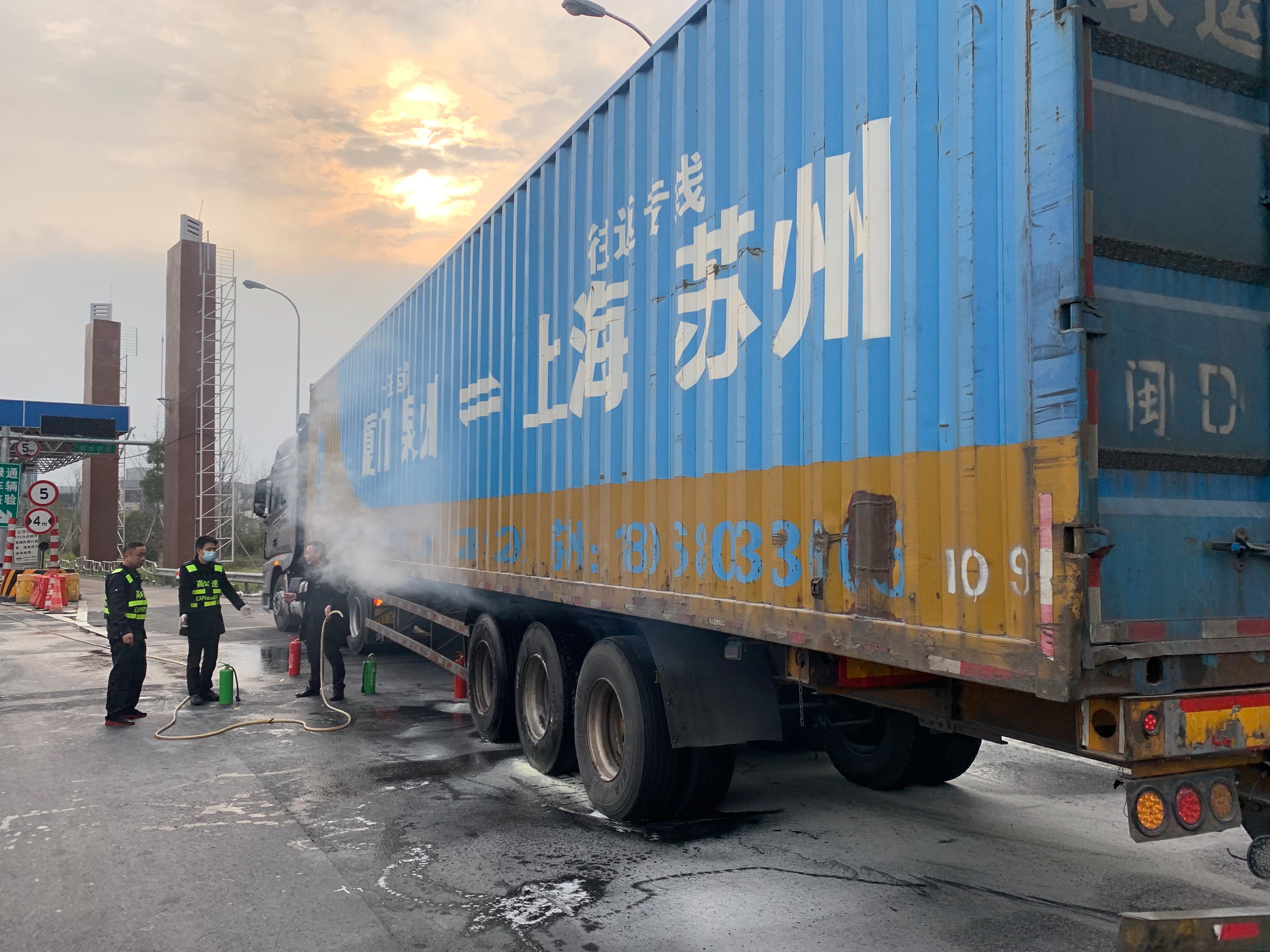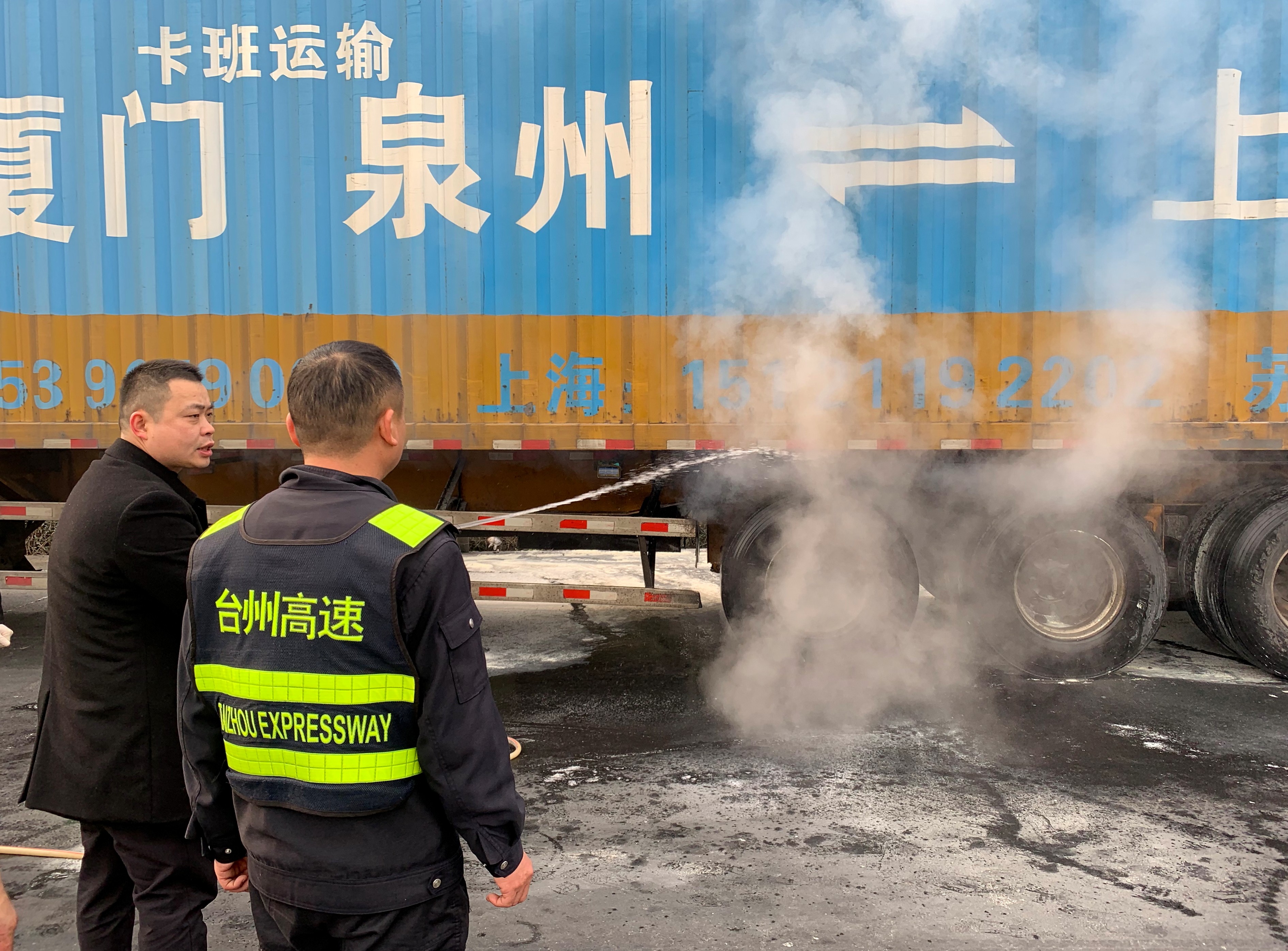 (圖為工作人員奮力救火) 就在這時,突然又一聲巨響, 貨車輪胎發(fā)生二次爆炸,火苗再次復(fù)燃。但大家絲毫不畏懼,提起滅火器對準(zhǔn)著火點(diǎn),快準(zhǔn)狠,火苗再次被撲滅。現(xiàn)場,輪胎處還冒著白煙,監(jiān)控中心何先林提議利用車道上的兩根水管的水對車輛輪胎進(jìn)行沖水降溫,避免再次發(fā)生爆炸。 經(jīng)過長達(dá)半小時的緊急救援,火勢終于得到控制,無人員傷亡,車輛也沒有造成損失。據(jù)了解,該車起火原因是輪胎上有鐵絲,摩擦產(chǎn)熱導(dǎo)致輪胎爆炸起火。 “太感謝了,全靠你們發(fā)現(xiàn),及時止損,不然車就燒沒了。”駕駛員連聲道謝。 在此提醒廣大司乘人員,上高速前務(wù)必要對車輛進(jìn)行全面檢查,特別是輪胎、剎車等重要部位,避免行車途中發(fā)生故障導(dǎo)致嚴(yán)重后果。 任青青