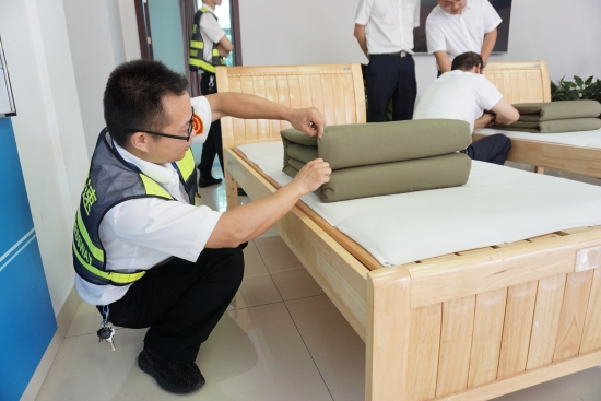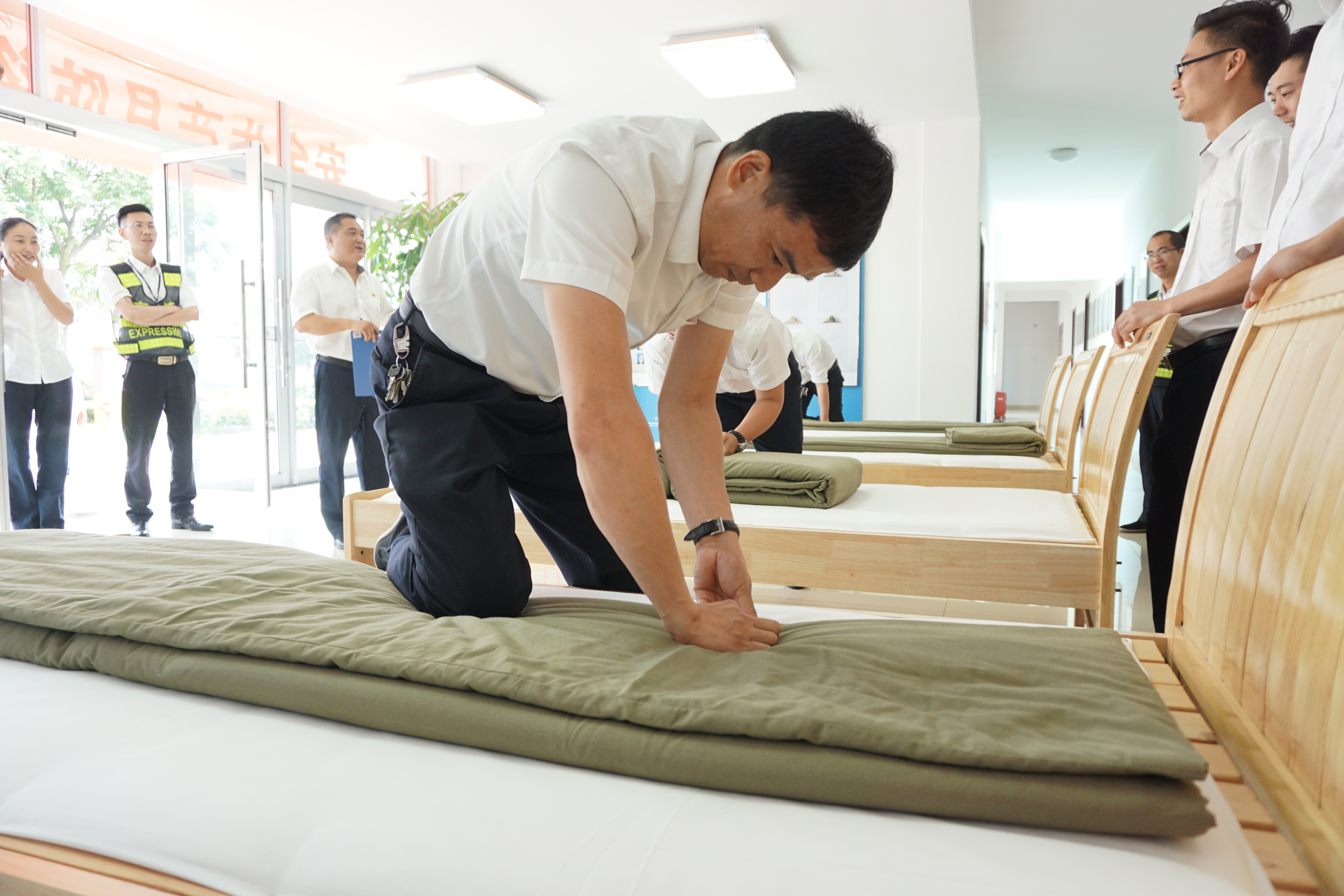 圖為比賽現(xiàn)場 活動現(xiàn)場,裁判宣布比賽規(guī)則及打分標(biāo)準(zhǔn):評分從被子整體形狀、平整度、棱角明顯、折疊時(shí)間等方面判斷,規(guī)定在5分鐘內(nèi)完成,共設(shè)置一、二、三等獎三個獎項(xiàng)。內(nèi)務(wù)半軍事化在該所已是常態(tài),參賽選手們很快進(jìn)入狀態(tài),從鋪到疊再到整,駕輕就熟,均能在規(guī)定時(shí)間內(nèi)整出“豆腐塊”。評委現(xiàn)場進(jìn)行點(diǎn)評和打分。經(jīng)過競逐,最后副站收費(fèi)四班何翊平奪得一等獎。比賽分四輪進(jìn)行,且全程用時(shí)不到1個小時(shí)。