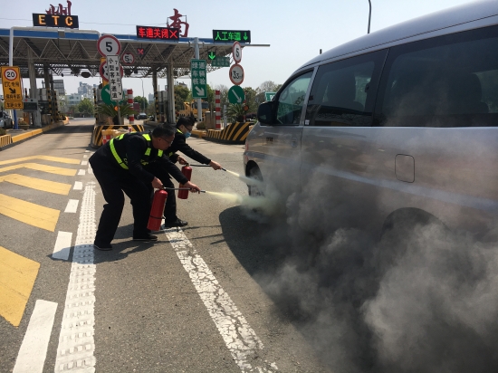 圖為交通事故應(yīng)急演練 在收費廣場交通事故應(yīng)急預(yù)案演練中,該所模擬了汽車在收費車道起火的交通事故。事故發(fā)生后,當班班長第一時間啟動預(yù)案,將險情報告監(jiān)控員,并立即關(guān)閉事故車道,組織人員對起火點進行前期壓制,同時指揮人員擺放標志,引導(dǎo)后續(xù)車輛,并快速放行。接到險情報告的所長、辦公室人員迅速趕到現(xiàn)場參與救援:女同志協(xié)助班組開足車道;部分男同志負責出入口車輛的疏導(dǎo)指揮工作;其余人員負責對火災(zāi)進行撲滅……大家各司其職,快速處理險情。