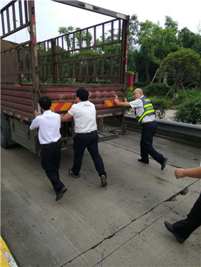 2018年5月27日,這本來是平凡普通的一天,可因?yàn)檫@件事,變成了不一樣的一天。 這一天,溫嶺西高速路收費(fèi)員洪燈杰像往常一樣,在一號超寬車道旁的收費(fèi)亭里工作。一輛綠色汽車剛走不久,卻發(fā)現(xiàn)后面一輛12軸型的小貨車停在那里,一動不動。洪燈杰心生疑惑,于是趕緊走出收費(fèi)亭,到小貨車跟前查看。原來,這輛車剛走到收費(fèi)站面前,便耗盡了電量,發(fā)動不了了。正在司機(jī)焦頭爛額之時(shí),班長湯明漲和其他收費(fèi)員吃飯回來,看見了這一幕。 湯明漲簡單地詢問了洪燈杰事情的經(jīng)過,本來準(zhǔn)備等拖車,可是現(xiàn)在正是中午車輛高峰期,加上五號車道在施工,等拖車不合適。如果導(dǎo)致一號車道堵車,切換成ETC也緩解不了。考慮到這些問題之后,湯班長決定叫來幾個“大力士”,幫忙推車。