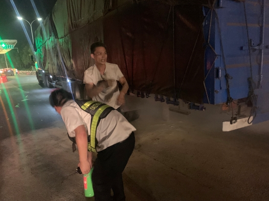 圖為收費(fèi)員協(xié)助司機(jī)滅火 當(dāng)時(shí),正值收費(fèi)員林王鍵負(fù)責(zé)高速入口的安全工作。他在巡查自助發(fā)卡機(jī)時(shí)發(fā)現(xiàn)入口處一輛貨車突然起火,隨之冒起了大片煙霧,并伴隨著刺鼻的氣味。林王鍵見狀立馬拎起身邊的滅火器就向貨車跑去,并且向班長(zhǎng)報(bào)告。在工作人員和司機(jī)齊心協(xié)力撲救下,大火十幾分鐘就被撲滅了。經(jīng)過檢查,起火的原因是因?yàn)樨涇噭x車突然抱死,摩擦起火。所幸大火并未造人人員傷亡和財(cái)產(chǎn)損失。 大火撲滅后,司機(jī)連連道謝,如果不是大家?guī)兔皶r(shí)撲滅,后果不堪設(shè)想,他為工作人員這種奮不顧身的精神點(diǎn)贊。 在此,提醒各位司機(jī),車輛上一定要配備滅火器等急救設(shè)備,特別在炎熱的夏天,是車輛起火的多發(fā)時(shí)期,配備滅火器可以有效控制火災(zāi),減少損失。 楊相暖