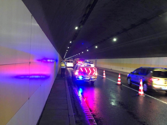 7月14日19時22分,中控員朱金飛發(fā)現(xiàn)黃土嶺寧向隧道1000米快車道處有車拋錨。立刻呼叫執(zhí)勤隊前往處置,隨即更改快車道交通信號。 執(zhí)勤隊迅速出警,幾分鐘后就趕赴事故現(xiàn)場,發(fā)現(xiàn)一輛白色面包車撞在隧道內(nèi)右側(cè),車輪箍嚴(yán)重受損,卡在護溝里,所幸無人員受傷。執(zhí)勤隊進行提前預(yù)警,預(yù)防二次事故的發(fā)生,并呼叫高速施救車輛支援,幾分鐘后施救車抵達,事故車輛安全拖離隧道,僅僅十分鐘,交通就恢復(fù)暢通。