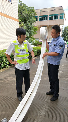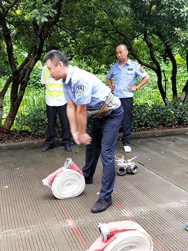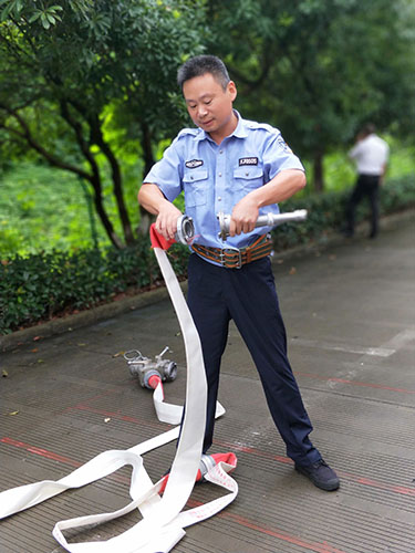 圖為主講人馮常敏操作示范現(xiàn)場 現(xiàn)場,“馮大師”腳下放著兩盤水帶,站姿已成“丁”字步,雙腿微曲,兩拇指與食指握住水帶根部,使虎口以順時針方向?qū)式涌谔?,做好甩開的準備?!八Φ谝槐P水帶,要運用手腕的力量,要提起水帶并高于地面20到30厘米,再用大臂帶動小臂的力量向前甩出?!?“馮大師”耐心地指導。 接下來是兩盤水帶連接的關鍵時候,“馮大師”左右手熟練操作,將如何連接的操作細節(jié)一一展現(xiàn)出來,同時邊操作邊說明注意事項,整套動作連貫又迅速,操作一氣呵成,一旁的新人仔細觀摩學習。