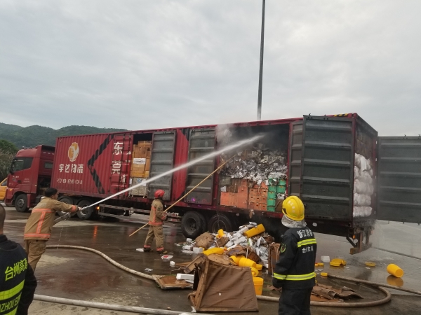 萬幸的是,恰逢溫州高速交警巡邏車經(jīng)過,隨即在該貨車后方預(yù)警,很快的所巡邏車、消防車先后到達(dá)現(xiàn)場(chǎng)協(xié)同滅火。由于該車貨物較多,且裝載物皆為紙箱和塑料,集裝箱底層溫度較高,一時(shí)只能將明火撲滅,但車廂內(nèi)仍有大量煙霧,為了安全,車子必須盡快撤離隧道,執(zhí)勤隊(duì)當(dāng)即決定讓駕駛員把車開往南廣場(chǎng)繼續(xù)滅火,消防車則一路緊隨其后滅火,以防火勢(shì)變大。