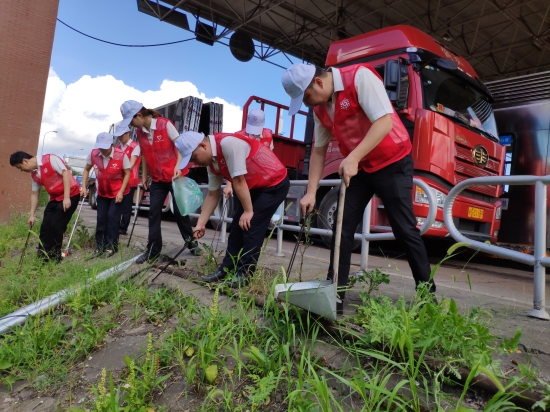 圖為志愿者合影 活動現(xiàn)場,身著紅馬甲的志愿者們,拿著垃圾夾、垃圾袋、掃把、畚斗等工具,重點清理收費站內(nèi)外廣場的煙頭和白色垃圾。由于上下高速時有不少司乘人員直接把垃圾丟向兩側(cè)邊溝,導致收費所兩側(cè)邊溝垃圾較多。盡管天氣炎熱,但志愿者們自行分組,三人一組、五人一隊,充分發(fā)揮不怕苦不怕累不怕臟的精神,并互相配合集中對一些死角進行清理。