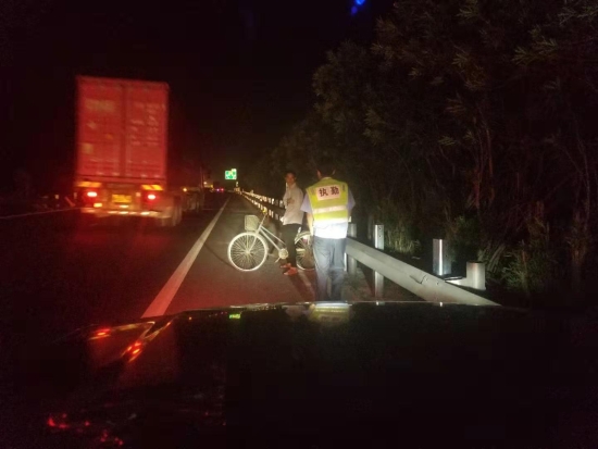 圖為執(zhí)勤隊發(fā)現(xiàn)騎車人 9月24日21:09分,大溪嶺隧道所中控室發(fā)出通知。執(zhí)勤隊員接中控指令,迅速出警。晚上九點,在高速公路上找人,需得打上12分的精神,巡邏車放慢車速,坐于后座的隊員們緊盯著車道兩旁,終于在21:14分,距離寧向隧道出口一公里處發(fā)現(xiàn)該騎車男子,隊員們立即上前將其攔住。眼前的一幕令執(zhí)勤隊員嚇出一身冷汗,該男子左手殘疾,單手騎車,晚上視線模糊,且高速公路上車多,速度快,司機很難發(fā)現(xiàn)有行人,如發(fā)現(xiàn)躥出來的行人而采取緊急制動,會造成多起追尾事故,現(xiàn)場情況非常危險!隊員們合力將自行車抬上車。