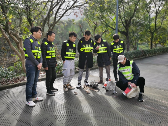 圖為陶文輝在教樂(lè)清公司員工如何進(jìn)行水帶操作 本次培訓(xùn)對(duì)隧道預(yù)警流程、二帶連接及執(zhí)勤隊(duì)在平時(shí)巡邏、預(yù)警、處理事故中如何確保自身安全等進(jìn)行重點(diǎn)講解。執(zhí)勤隊(duì)長(zhǎng)帶領(lǐng)隊(duì)員們?cè)诠芾硭賵?chǎng)進(jìn)行模擬主線卡口、事故拋錨車(chē)預(yù)警封道操作,樂(lè)清公司員工觀摩之后也進(jìn)行實(shí)際操作,孫鵬詳細(xì)講解擺放隔離錐應(yīng)注意事項(xiàng),每一隔離錐的間隔位置、巡邏車(chē)后方擺放的安全距離,事故處理之后,收隔離錐應(yīng)注意的安全動(dòng)作。陶文輝為樂(lè)清公司員工演示“二帶連接”,并對(duì)水帶的甩、接、收每一動(dòng)作盡可能詳細(xì)仔細(xì)地進(jìn)行解說(shuō)示范。