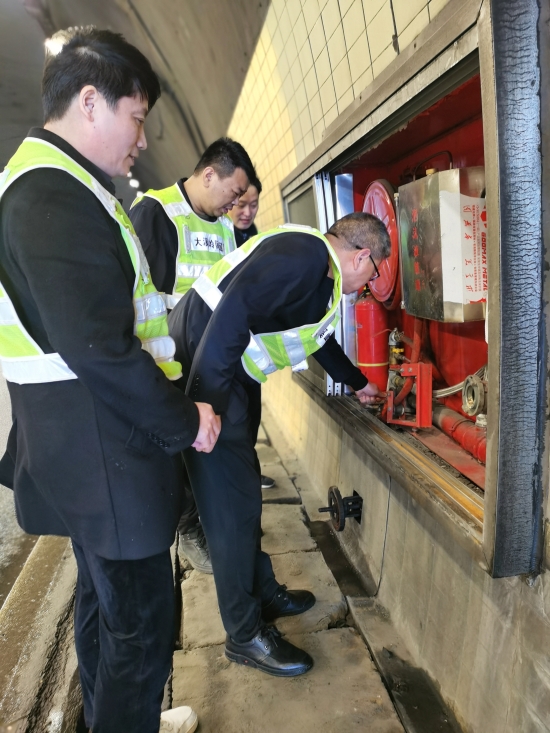 圖為檢查組檢查隧道內(nèi)的消防設(shè)備