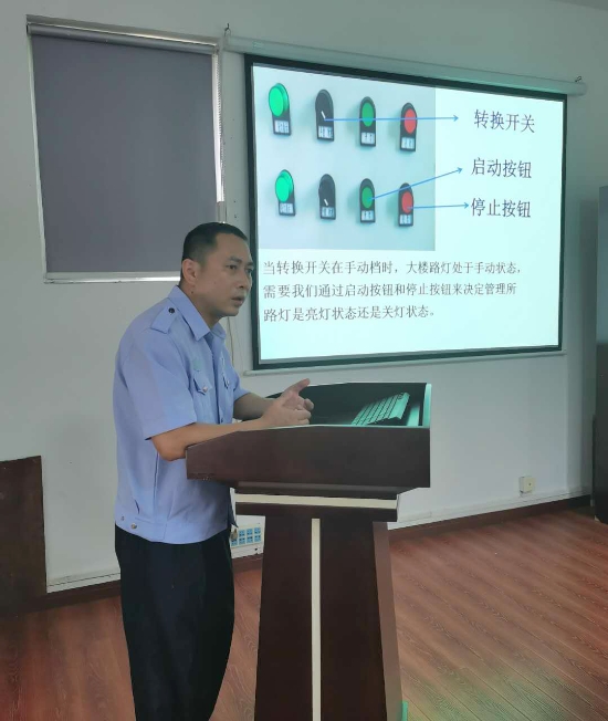 圖為電工業(yè)務培訓現(xiàn)場 湯寧光在電工崗位已經(jīng)19載,有著豐富的工作經(jīng)驗。他用聊家常的方式來講解線路控制的工作原理圖、電路的故障排除方法、光控開關(guān)的接線方法,PPT課件中配有隧道所配電房中相應的照片和線路圖,并注解,簡潔明了,通俗易懂。在授課過程中,他每講到一處結(jié)尾,便與聽課人員互動,現(xiàn)場為大家答疑解惑,課堂氛圍熱烈,互動感很強。