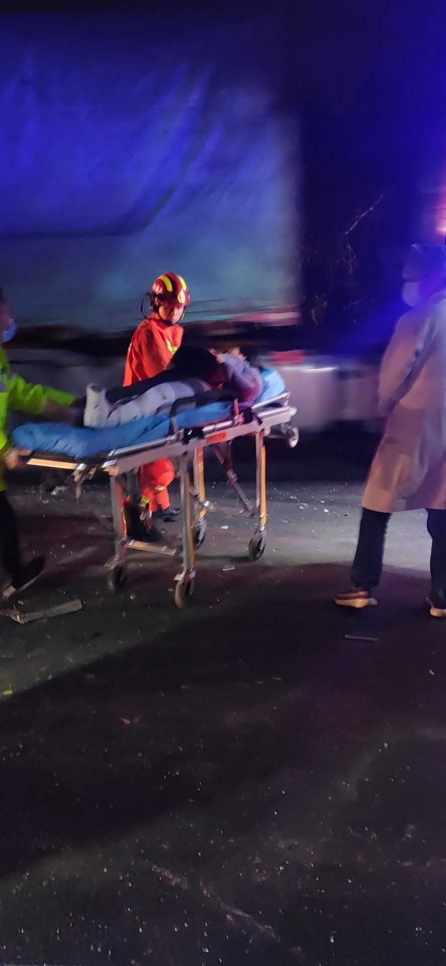 21:50巡邏車和消防車同時到達(dá)現(xiàn)場,隊員陳幸飛快的跑下來,以百米沖刺的速度做好巡邏車的安全措施和預(yù)警工作,有3人受傷,事故車頭已嚴(yán)重變形,一名女性腰部受傷坐在地上,語速正常,思維清晰。還有二名人員被卡在駕駛室,消防隊員正在查看現(xiàn)場準(zhǔn)備施救,受傷人員哭爹喊娘嚎聲不斷,由于救護(hù)車還沒達(dá)到現(xiàn)場,陳幸在事故車后方硬路肩上維護(hù)秩序,防止車輛占道,并同時迎接救護(hù)車,湯寧光則在維護(hù)現(xiàn)場秩序,阻止其他司機(jī)圍觀影響救援。 22:00第一輛救護(hù)車到達(dá)。醫(yī)護(hù)人員準(zhǔn)備擔(dān)架,另一名醫(yī)生去詢問坐在地上的受傷人員,由于車頭嚴(yán)重變形,司機(jī)與鄰座的人都被卡在駕駛室,經(jīng)過消防員的救援,受傷最嚴(yán)重的司機(jī)首先被救了下來,在被救下的那刻暈了過去,醫(yī)護(hù)人員立該把傷員抬上救護(hù)車,緊接著消防員救下第二位被卡傷員,第二輛救護(hù)車帶著傷員離開,最后一輛救護(hù)車卻遲遲沒到,經(jīng)聯(lián)系監(jiān)控中心后得知救護(hù)車已上高速,但因后方車輛太多,救護(hù)車和拖車都被堵了,經(jīng)和臺州高速交警協(xié)商后,最后清理一個車道讓救護(hù)車和拖車先開上來,巡邏車去事故車后方預(yù)警,22:30救護(hù)車帶走最后一名傷員,事故車被拖走,路面恢復(fù)正常通車。