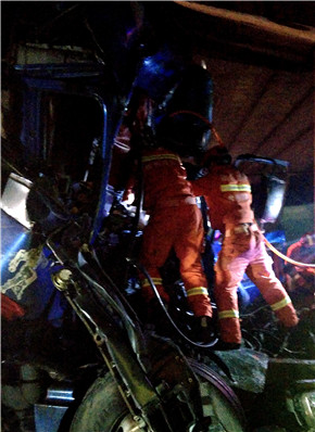 5分鐘后,兩輛紅藍(lán)警燈閃爍的施救車迅速飛至現(xiàn)場(chǎng)。此時(shí)現(xiàn)場(chǎng)多車損毀嚴(yán)重,尤其最后一輛大貨車駕駛室嚴(yán)重變形,司機(jī)受傷,胸部以下被車頭卡住無法動(dòng)彈,血水從門縫流出,現(xiàn)有設(shè)備無法有效救援,也無法知道有無生命危險(xiǎn)。