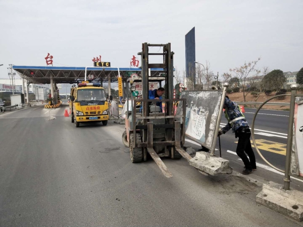 零費用清除沉重的廣告式隔離帶 “副站匝道外的廣告式隔離帶能不能幫忙清除下?” 在接到臺州南收費所的“求助”電話后,施救中心負責人馬上發(fā)動人員,迅速聯(lián)系了外協(xié)單位-----臺州市路橋通遠車輛施救有限公司,開動鏟車奔赴現場。 據悉,臺州南副站匝道廣告式隔離帶比較長,而且有損壞,不美觀而影響站所形象,需要全部更換成水馬。但是其底部的水泥墩非常沉重,人力不能搬動,所以該所希望施救中心幫忙清除這些廢舊物。