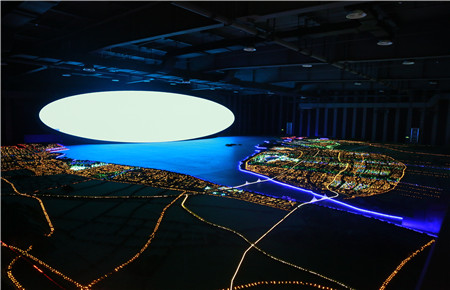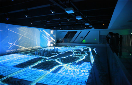 圖為考察團觀看東部新區(qū)墻暮宣傳影片