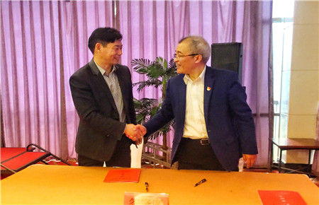 圖為集團副總經(jīng)理陳保衛(wèi)與國資委主任徐豪簽訂責任書后握手
