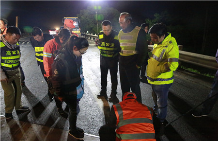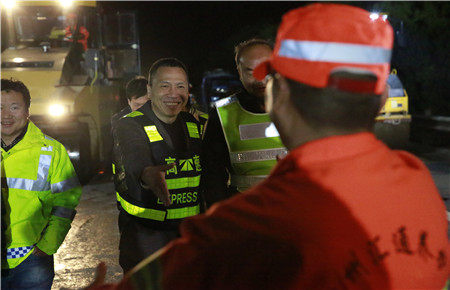 路面養(yǎng)護施工已經(jīng)第五天,當(dāng)晚計劃完成K1655+897-K1656+943之間860米的路段罩面,銑刨6個橋頭。工人們每天夜出晝伏,持續(xù)的徹夜工作,違反生理規(guī)律、勞動強度較大,體力精神上都比較辛苦。盡管張建平在此期間一直參加黨校學(xué)習(xí),但還是百忙之中特地抽時間到施工現(xiàn)場為工作人員加油打氣。