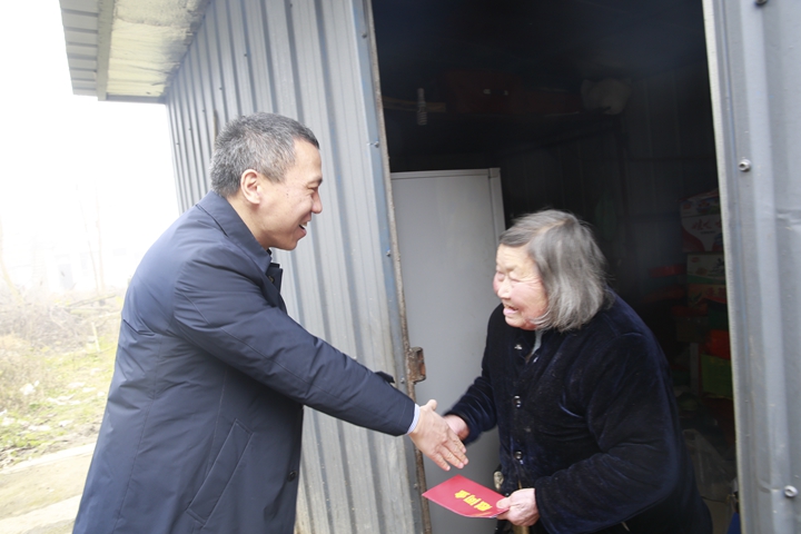 圖為集團(tuán)總經(jīng)理張建平走訪慰問(wèn)老人鮑于朝