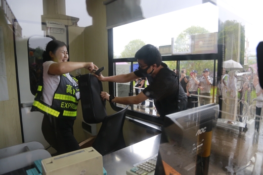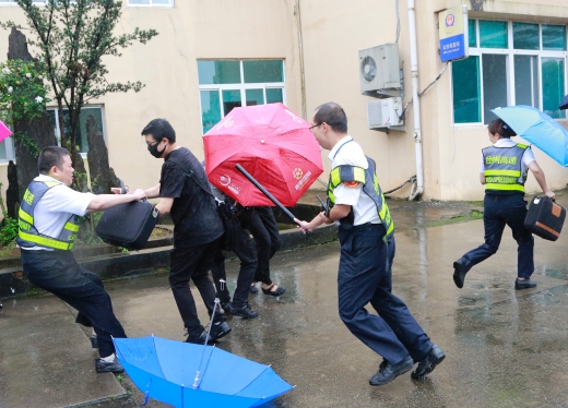 隨后,多名參演員工冒雨模擬收費崗?fù)ず土嘘犗聧徳庥觥按跬健睋尳俚那榫伴_展防盜搶演練。現(xiàn)場,2名蒙面歹徒執(zhí)仿真刀、軟棍威脅收費員交出現(xiàn)金,危機(jī)之中,收費站立即啟動應(yīng)急處置預(yù)案并報警求助,收費員有效與歹徒周旋,應(yīng)急處置組人員迅速攜鋼叉、橡膠棒、勞動工具等赴現(xiàn)場支援,值班領(lǐng)導(dǎo)、收費班長、監(jiān)控員合力協(xié)作應(yīng)對歹徒,防盜搶演練順利結(jié)束。