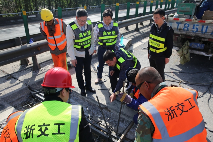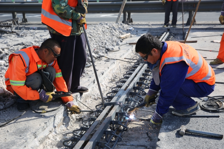 隨后,在伸縮縫型鋼安裝現(xiàn)場,陳文波撿起鑿除的碎渣,查看被鑿除的舊伸縮縫情況。公司所轄路段屬于軟土路基,且有91座橋梁,由于運(yùn)行時(shí)間已20余年,部分橋梁伸縮縫破損較為嚴(yán)重,如何維修橋梁伸縮縫和橋頭跳一直是個(gè)老大難問題。在橋梁伸縮縫修補(bǔ)現(xiàn)場,因?yàn)橹剀嚨哪雺?,部分伸縮縫已經(jīng)磨損嚴(yán)重,所在的混凝土路面只能借助鑿巖機(jī)進(jìn)行作業(yè)。