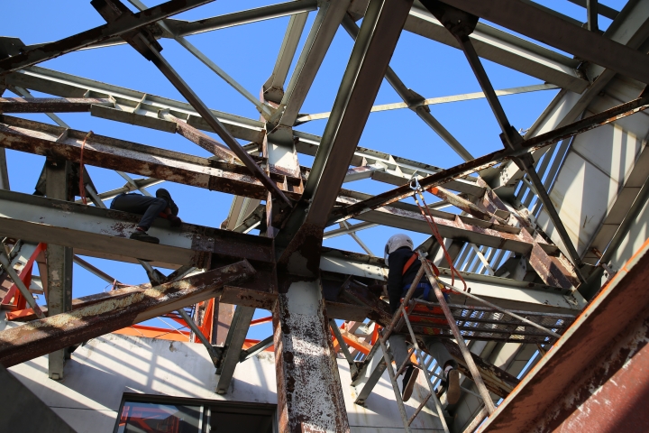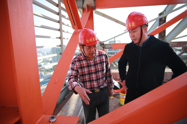 集團(tuán)安全總監(jiān)項同富檢查天和大廈除銹施工 11月15日下午,集團(tuán)安全總監(jiān)項同富在辦公室、房產(chǎn)公司相關(guān)人員的陪同下,到天和大廈樓頂鋼架除銹施工現(xiàn)場檢查施工進(jìn)展和安全工作。 集團(tuán)總部天和大廈樓頂鋼架跨度大,高低水平不一致,很難搭建大范圍的防護(hù)網(wǎng)及腳手架等施工輔助工具,也無法采用大型機(jī)械打磨除銹的方式除去表面的銹層,只能靠手工和電動角磨機(jī)除銹。施工人員常常進(jìn)行高空作業(yè),安全隱患大。