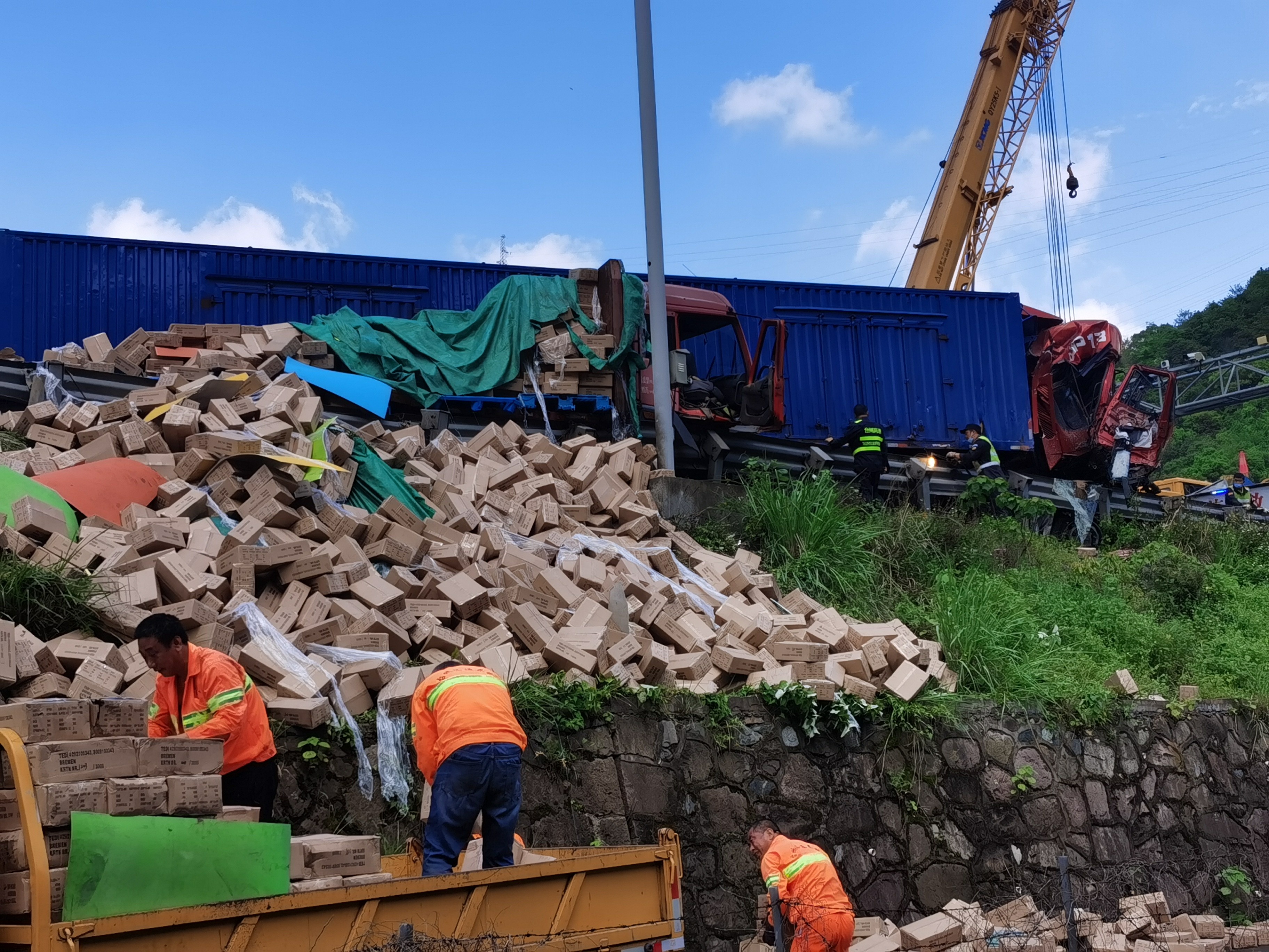 隨后,拖車、救護(hù)車、吊車相繼到達(dá),所有人員立即有序分工,因大貨車車頭卡在護(hù)欄,需要切割,拖車難度較大需要吊車將其拖出,現(xiàn)場救援緊急開展。隧道所工作人員協(xié)助駁貨車清理貨物和散落的車架,保證高速路面通暢。 后經(jīng)詢問了解,平板貨車因車輛拋錨停在黃土嶺寧向洞口200米處,雖然已將安全警示牌放在車輛后方,但車輛未完全停靠邊上。后方一輛箱式貨車發(fā)現(xiàn)時(shí)緊急剎車,由于當(dāng)時(shí)正下大雨路面濕滑,緊急制動后車輛發(fā)生擺尾失控,司機(jī)急打方向想要救車阻止,但是依然撞上了前方的拋錨貨車。 再次提醒廣大司乘人員,雨天路滑,要控制車速保持車距離,遇車輛拋錨,車靠邊人撤離,并撥打高速救援電話12122。 蔣弓