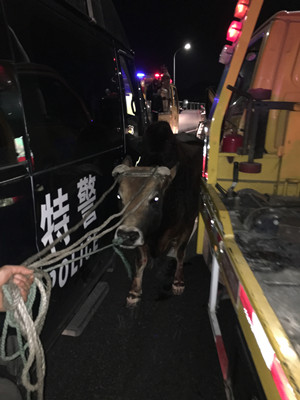 警報拉起,警燈閃爍,猛牛在施救車和巡邏車護送下,走過黃土嶺隧道,并在警車引導(dǎo)下,走向臺州收費所出口。晚7:00時在即將出口時,牛開始受驚,四處突圍,為避免事故,飛速趕過來的臺州110特警擊中了牛蹄,制伏了開始發(fā)瘋的牛。費了老大力氣,特警、交警及施救人員總算合力將牛抬上施救車安全帶下了高速公路 。 據(jù)悉,這起事件由于一輛運牛的貨車沒有做好安全措施,行駛過程中,牛逃下了車。所幸,處置到位,沒有釀成安全事故 。 鄭蔚