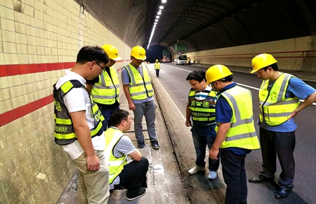 在施工現場,隨處可見工程部人員的身影,他們奔走于各個作業(yè)點,緊跟施工進度、緊盯施工質量、協(xié)調施工相關問題。工程部管理人員嚴格注重隧道施工的質量與安全管理,現場跟進監(jiān)督并要求施工單位設立安全領導小組,嚴格對現場安全、質量進行把控,確保安全質量零漏洞。當施工人員提出在活動腳手架上不方便安裝監(jiān)控攝像機時,維養(yǎng)中心負責人葉俊及時為他們聯(lián)系了登高車,大大節(jié)省了安裝時間。另外,趁塘嶺隧道施工之際,工程部積極響應部里隧道安全風險防控文件及新規(guī)范要求,完成了隧道口混凝土翼墻增設、三波護欄過渡段設置、洞口導流標線漆畫等系列工作。