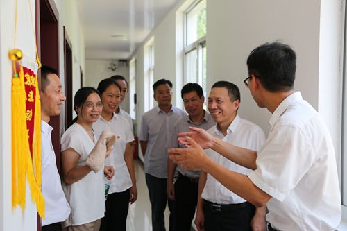 圖為集團(tuán)總經(jīng)理張建平在文明寢室流動(dòng)紅旗前暢談