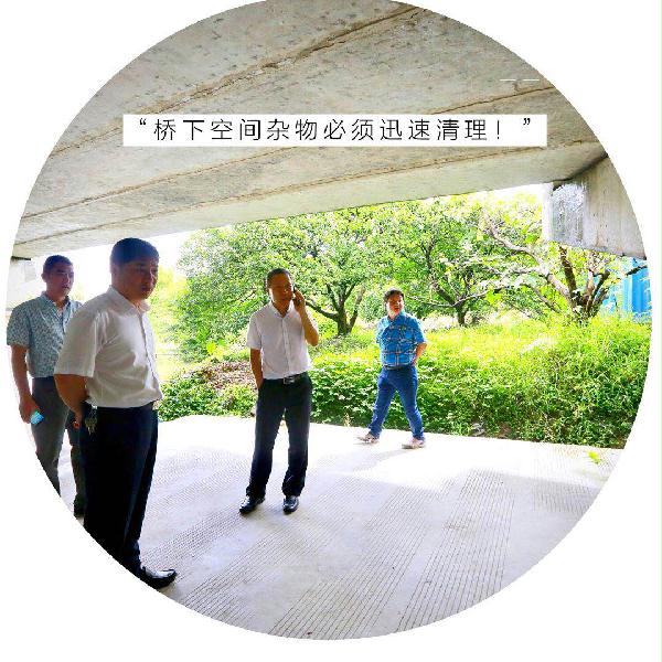 下洋塢橋,看到當?shù)匕傩赵跇蛳驴臻g新堆砌的雜物,張建平馬上電話給當?shù)卮彘L,要求立即處理。