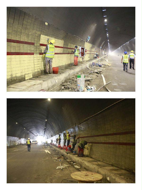 大溪嶺隧道機電整治施工現(xiàn)場,隧道壁正在做墻面處理,隧道內(nèi)高溫且揚塵惡臭。