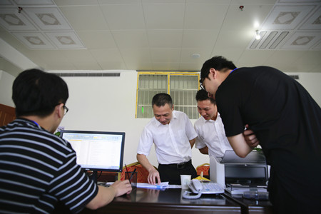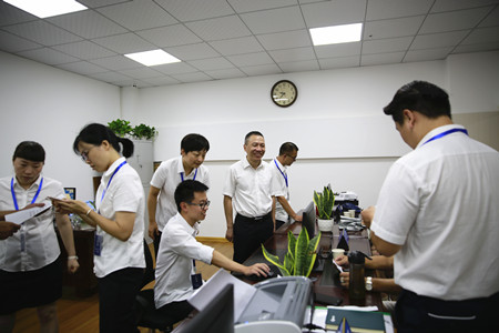 圖為集團副董事長、總經(jīng)理張建平在臨海股權(quán)收購點檢查工作人員業(yè)務(wù)操作