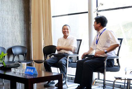 圖為集團副董事長、總經(jīng)理張建平向股權溫嶺收購點工作人員問候