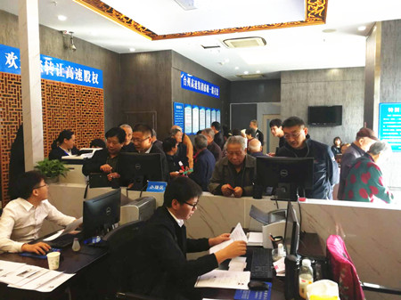 10月31日當(dāng)天,全市各收購(gòu)點(diǎn)股東絡(luò)繹不絕,股東轉(zhuǎn)讓熱情高漲,場(chǎng)面尤其火爆。當(dāng)天下午,收購(gòu)時(shí)間點(diǎn)過后,還有股東在收購(gòu)點(diǎn)辦理轉(zhuǎn)讓手續(xù)。