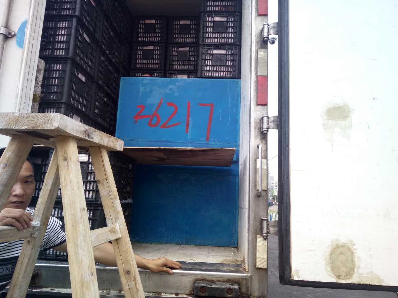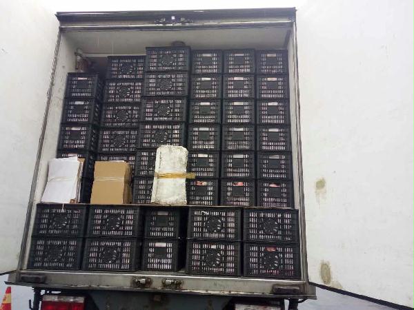 圖為被處罰的車輛 早上10點(diǎn)40分左右,這輛運(yùn)蘋果的貨車駛?cè)胧召M(fèi)站的一號(hào)崗?fù)ぃ緳C(jī)師傅說自己運(yùn)的是蘋果,根據(jù)公司規(guī)定,綠農(nóng)車檢查必須開車門檢查貨物。憑著多年的檢查經(jīng)驗(yàn),當(dāng)班班長(zhǎng)童軍偉發(fā)現(xiàn)這輛綠農(nóng)車有問題,覺得重量遠(yuǎn)遠(yuǎn)不夠,可能不符合“綠農(nóng)”免費(fèi)政策。果不其然,車廂中“深藏玄機(jī)”,左右兩側(cè)各有一排玻璃鋼魚箱,這就給檢查增加了難度。當(dāng)班班長(zhǎng)要求司機(jī)師傅把最后兩排箱子拿掉,想檢查玻璃魚缸,然而這個(gè)司機(jī)極其不配合,還惡意刁難工作人員,說什么也不搬蘋果。