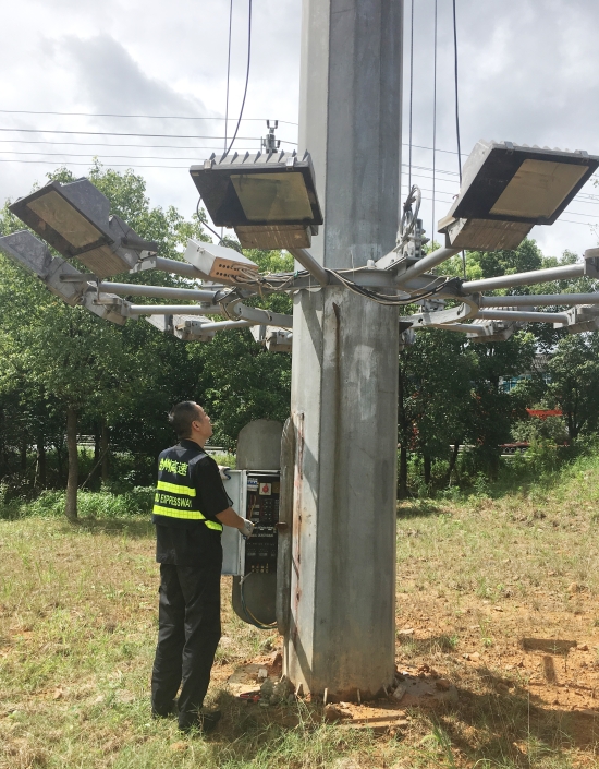 圖為工作人員清除收費頂棚垃圾 及時下降各收費所互通區(qū)高桿燈。為提升互通區(qū)照明亮度,減少因選錯路口而帶來的不必要的麻煩,集團在各收費站出入口互通區(qū)共安裝了11盞40米高度高桿燈,每盞高桿燈上方有12盞鈉燈。倘若這些高桿燈上鈉燈在臺風(fēng)襲擊下一旦掉落后果將不勘設(shè)想。8月8日,中心再次召集各班人員對收費沿線高桿燈進(jìn)行了下降處理。因高桿燈四周雜草叢生,在下降時維修隊員不僅要忍受底下蚊蟲肆意叮咬,還要克服時而烈日時而大雨的怪異天氣,沒放幾盞隊員便濕透了全身,衣服是濕了又干,干了再濕。