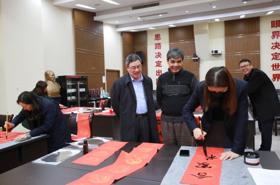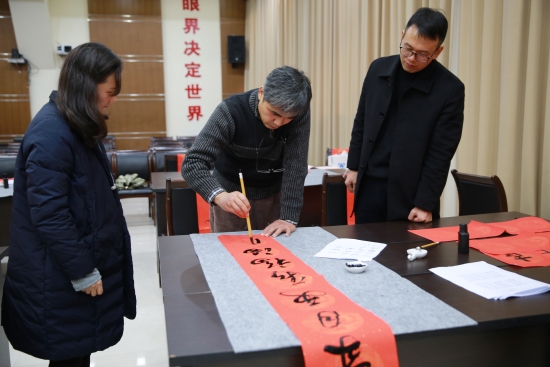 臺(tái)州高速集團(tuán)開展“寫春聯(lián)、送祝?!被顒?dòng) 春節(jié)將至,臺(tái)州高速集團(tuán)開展以“迎新春、送祝福”為主題的寫春聯(lián)、送春聯(lián)活動(dòng),并邀請(qǐng)書法老師到場(chǎng)指導(dǎo)。來自集團(tuán)各部室、所、子公司的書法愛好者紛紛前來參與,集團(tuán)董事長、總經(jīng)理陳文波到場(chǎng)觀摩。