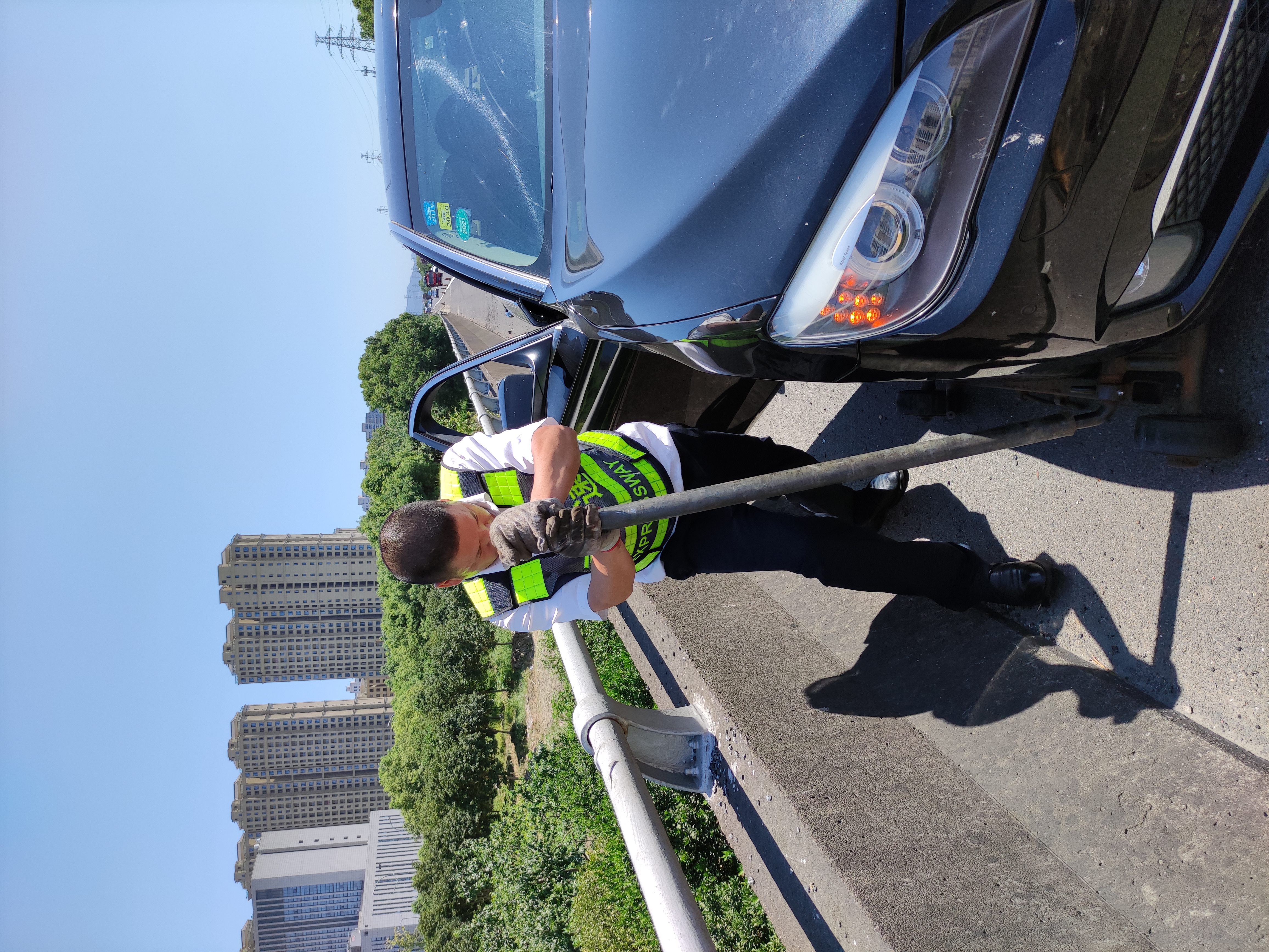 等待救援的是一輛寶馬小轎車,車子忽然發(fā)動(dòng)不了,再加上高速上的炎熱和沉悶的空氣,車主很著急。