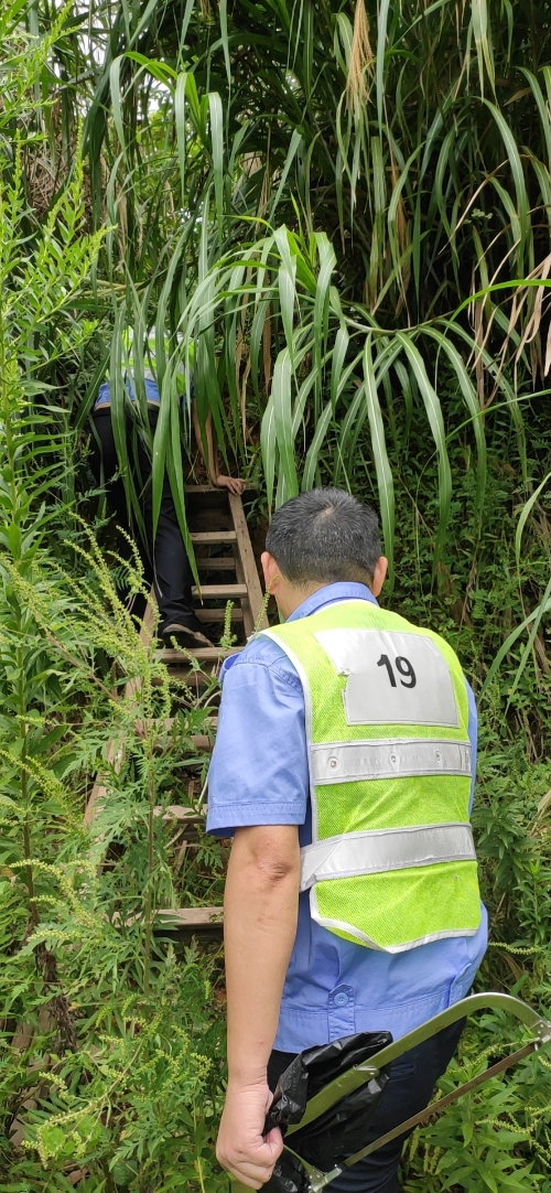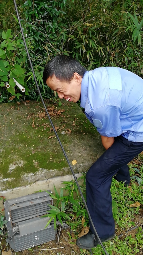 9月23日早上8點45分,中控員發(fā)現(xiàn)大溪嶺隧道北高位水池圖像模糊,照明燈不亮了。 為保障隧道消防安全,中控員對消防水池的水位需時時關(guān)注,萬一水池漏水無法及時查看,如遇火災,消防水供應不上,后果不堪設(shè)想。隊長意識到事情的嚴重性,即刻安排電工湯寧光和陳幸趕往北面山上的高位水池位置。初秋的山上植物茂盛,原來通往水池的小路早已淹沒在雜草間,隊員們提著工具,憑著記憶找小路,單手撥開雜草往山上走,到達高位水池之后,他們分工協(xié)作,一邊檢查線路,一邊抬開井蓋并下到水池檢查照明燈,經(jīng)過檢查后發(fā)現(xiàn)只是線路有點松動,陳幸馬上對線路進行加固。