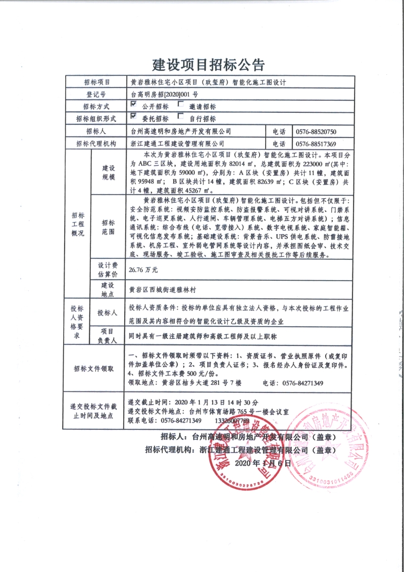 黃巖雅林住宅小區(qū)項(xiàng)目(玖璽府)智能化施工圖設(shè)計(jì)招標(biāo)公告