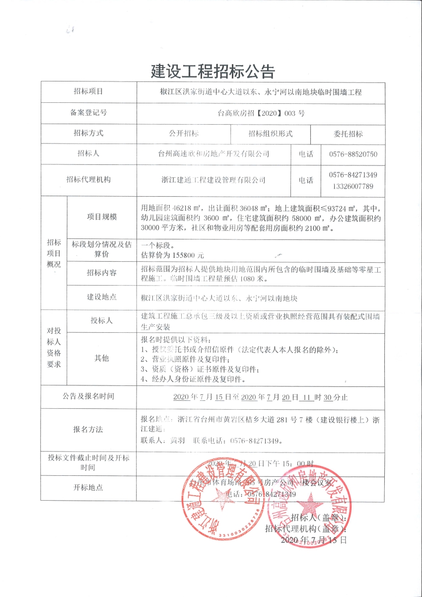 椒江區(qū)洪家街道中心大道以東、永寧河以南地塊臨時(shí)圍墻工程
