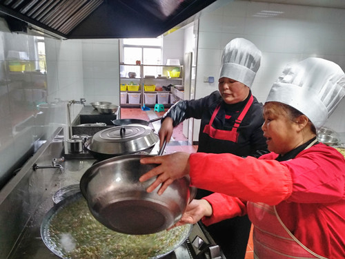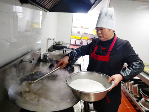 浸了一夜的早米,用石磨磨成米漿,細(xì)膩而幼滑,被靜置在盆里。“一般都用米粉泡水,口感粗糙,而且吃起來沒有香頭?!崩ㄒ贿呎f,一邊將香腸切碎與豆腐、冬筍、胡蘿卜、芹菜、香菇、蠶豆瓣翻炒著。旁邊的大鍋里,長(zhǎng)長(zhǎng)的豆面在骨頭湯里翻滾著,像一棵棵舞蹈的海草。徐徐倒入的米漿,被不停地?cái)嚢瑁耙钦车藉?,就?huì)有焦糊味,這鍋羹就算廢了?!泵诐{好像不夠,利花有些懊惱,“要是在家里,米漿都會(huì)多準(zhǔn)備一些,不夠就隨手添,我?guī)У竭@里就這些,也沒得加了。”就叫在一邊做幫手的妹妹寶花用面粉和山粉(也就是番薯粉)摻水拌起來,倒入鍋里,湯漸漸濃稠起來,倒入之前炒好的配料,加上切得細(xì)細(xì)的綠綠的芥菜梗、芥菜葉、海蠣,鍋里不時(shí)冒起大泡,香氣四溢。 為照顧吃不慣糟羹的同事,食堂還準(zhǔn)備了一鍋甜的山粉糊。來自臺(tái)州各縣市區(qū)的同事,按各自飲食習(xí)慣選擇了咸的或甜的。有說芹菜的味道蓋過了芥菜清香的,有說沒有加入芋頭口感不夠糊的,但撲鼻的香氣和濃厚豐富的口感立刻讓人忘了挑剔。對(duì)我來說,碧綠的芥菜葉和白胖的海蠣肉是整碗羹的顏值擔(dān)當(dāng)和靈魂所在。 每個(gè)元宵節(jié),對(duì)于在崗的同事們是沒有花燈可看、沒有燈謎可猜的,也不能與家人聚在一起吃羹。車道上此刻正是流量高峰期,大家匆匆吃完,都要趕著上崗。食堂大姐把多出的糟羹和山粉糊放進(jìn)蒸飯鍋保溫,叮囑大家下班后再來吃點(diǎn),這個(gè)吃了不扛餓。此時(shí),除了食物最能體現(xiàn)節(jié)日氣氛外,還有那一份特意為你留著的溫?zé)岣屓烁袆?dòng)。 鄭瑛芝